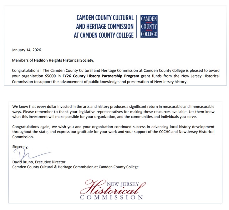 We are so pleased to announce that HHHS has been awarded a $5,000 grant from the FY26 County History Partnership Program. This grant will help us continue inventorying Haddon Heights historical material currently stored in the Library. The end result will allow this material to be more accessible to the public.